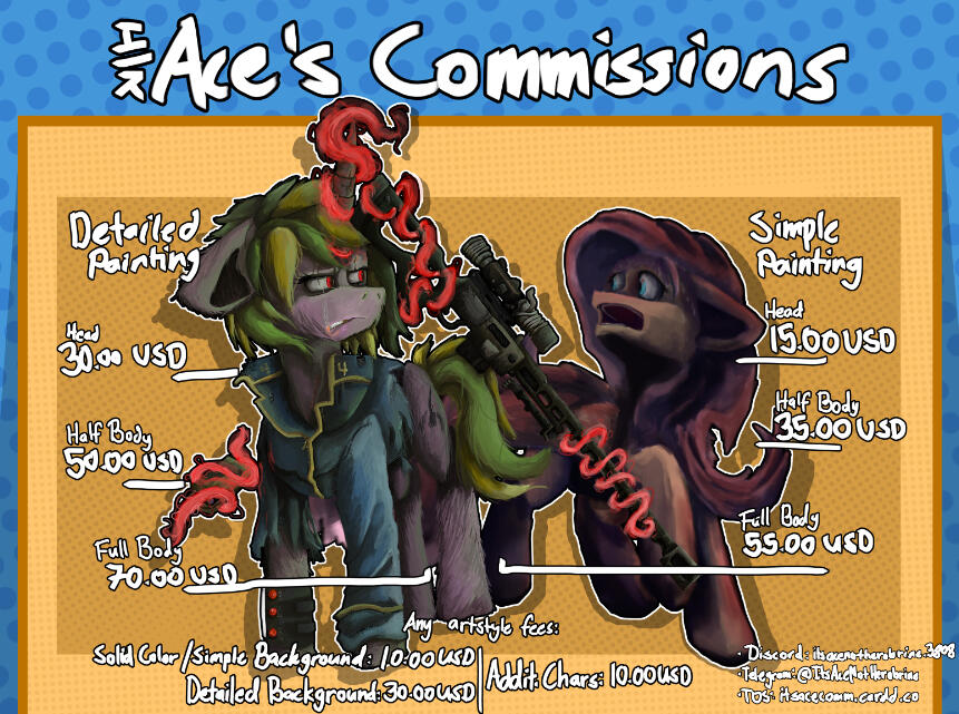 1. Send me a private message through my Discord or Telegram.2. Provide commission details, and I would be happy if it is more detailed. I recommend sending images of references and some of my existing artworks to help me further understand what you want.3. After reviewing your request, the commission will be finalized. Any major adjustments after this stage will not be accepted.4. Then, I will provide the pricing based on my commission rates. A 50% upfront payment is required before I start